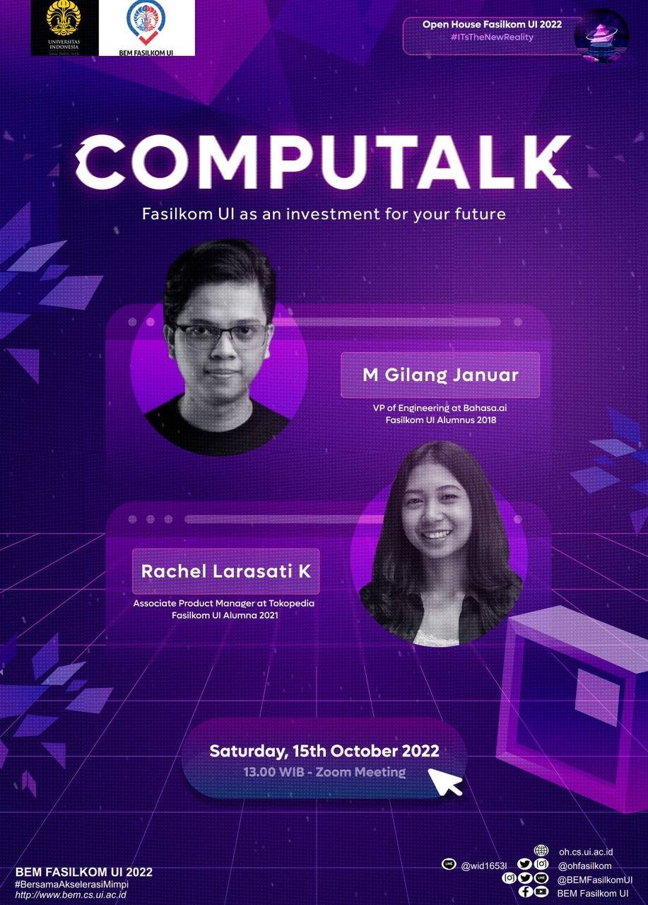 Dengan narasumber yang tidak kalah menarik, CompuTalk Vol. 2 menghadirkan alumni Fasilkom UI yang akan menceritakan bagaimana Fasilkom UI memberikan impact yang sangat besar bagi kehidupan mereka, lho.🤗