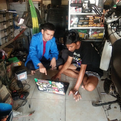 Gambar ini menunjukkan mahasiswa Universitas Pamulang, Khairullah Tulfah, sedang melakukan uji coba aplikasi sistem pakar berbasis web bersama salah satu mekanik di Bengkel Bams Motor, Rajeg – Tangerang. Kegiatan ini merupakan bagian dari tahap implementasi aplikasi yang dikembangkan untuk membantu mekanik dalam mendiagnosis kerusakan mesin sepeda motor. Mahasiswa menjelaskan cara penggunaan sistem melalui laptop, sementara mekanik mencoba langsung memasukkan data gejala kerusakan. Tujuannya adalah untuk memastikan bahwa aplikasi mudah digunakan dan hasil diagnosis sesuai dengan kondisi mesin sebenarnya.