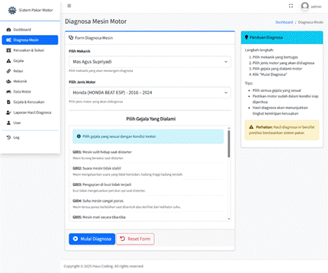 Gambar 2. Tampilan Halaman Diagnosa Mesin pada Aplikasi Sistem Pakar Motor