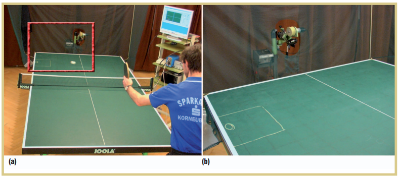 (a) Robot tenis meja dengan penyesuaian tetap melayani bola pemain dalam interval pendek.