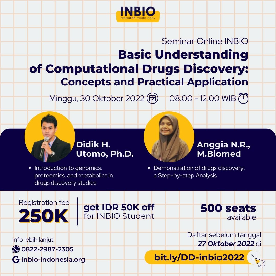 Untuk sesi ini, kamu cuma perlu membayar Rp 250.000 dan kita akan mengupas tuntas tentang Computational Drugs Discovery selama 4 jam bersama Didik H.Utomo, Ph.D dan Anggia N.R., M.Biomed