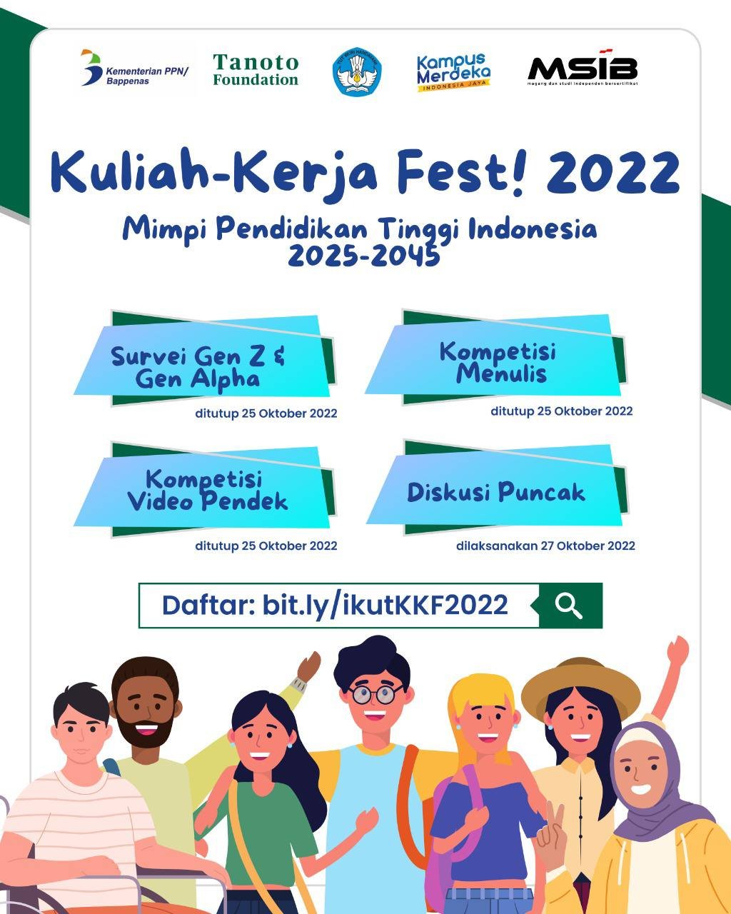 Yg lebih mudah lagi, cuma butuh 2 kali klikkk, di share ke jejaring kalian ya! Karena Kuliah-Kerja Fest! 2022 itu tujuannya melihat sisi harapan jangka panjang generasi muda (Gen Z dan Gen Alpha) tentang pendidikan tinggi dalam aspek akses, relevansi, daya saing, dan tata kelola perguruan tinggi.