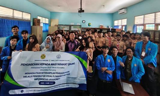 Tim mahasiswa dari Program Studi Teknik Informatika, Fakultas Ilmu Komputer, Universitas Pamulang, telah berhasil menyelenggarakan kegiatan Pengabdian kepada Masyarakat (PKM) yang bertajuk “Meningkatkan Keterampilan Pemrograman Melalui Pendekatan Visual Flowgorithm Dan Implementasi Javascript Di SMPN 17 Kota Tangerang Selatan”. Kegiatan yang ditujukan bagi siswa-siswi SMP Negeri 17 Kota Tangerang Selatan ini bertujuan untuk memperkenalkan dasar-dasar algoritma dan pemrograman dengan cara yang menarik dan mudah dipahami