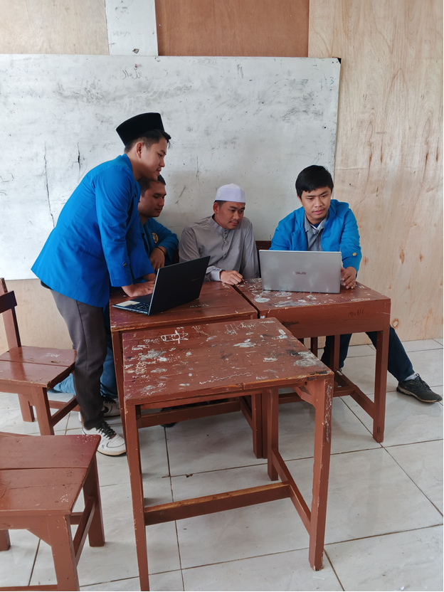Selain proses serah terima, terlihat juga dokumentasi saat mahasiswa melakukan pelatihan dan pendampingan kepada pihak madrasah. Dalam ruangan kelas sederhana, para mahasiswa duduk bersama ustaz sambil menunjukkan cara kerja sistem atau aplikasi yang telah mereka buat di layar laptop. Mereka tampak berdiskusi aktif dan menjelaskan dengan detail fitur-fitur yang ada dalam sistem informasi madrasah tersebut. Kegiatan ini menunjukkan adanya proses transfer ilmu pengetahuan dan teknologi secara langsung dari mahasiswa kepada masyarakat.