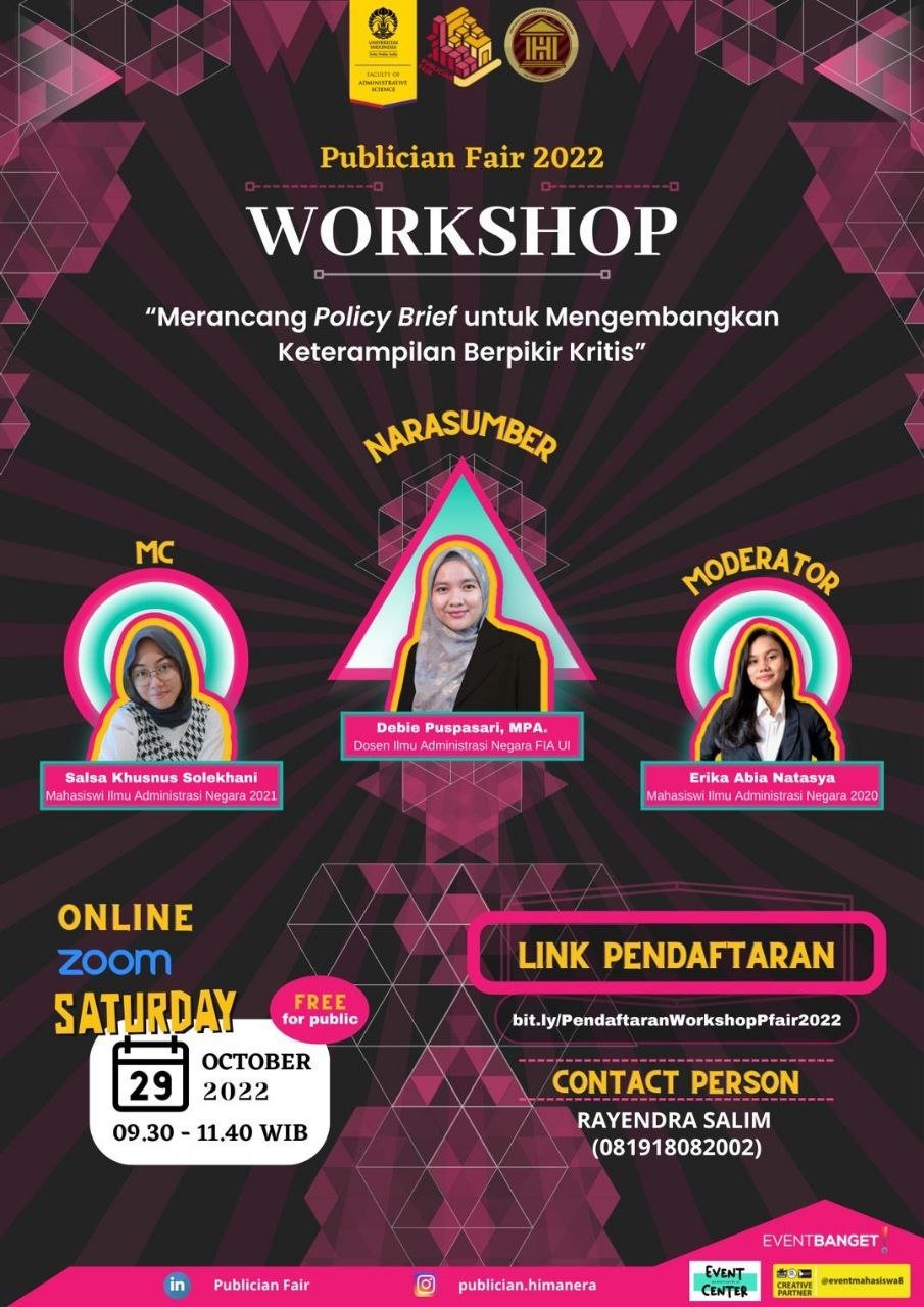 Workshop Publician Fair tahun ini mengusung tema “Merancang Policy Brief untuk Mengembangkan Keterampilan Berpikir Kritis” dan akan diselenggarakan pada: