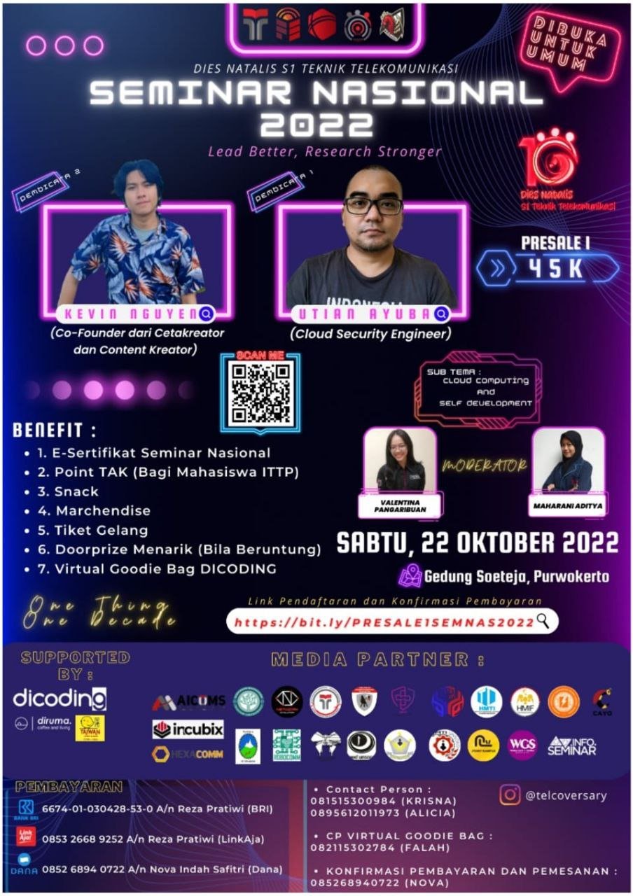 Tunggu Apalagi langsung ajak rekan rekan kalian semua untuk pesan dan datang ke SEMINAR NASIONAL DIESNATALIS S1 TEKNIK TELEKOMUNIKASI 2022 ini.